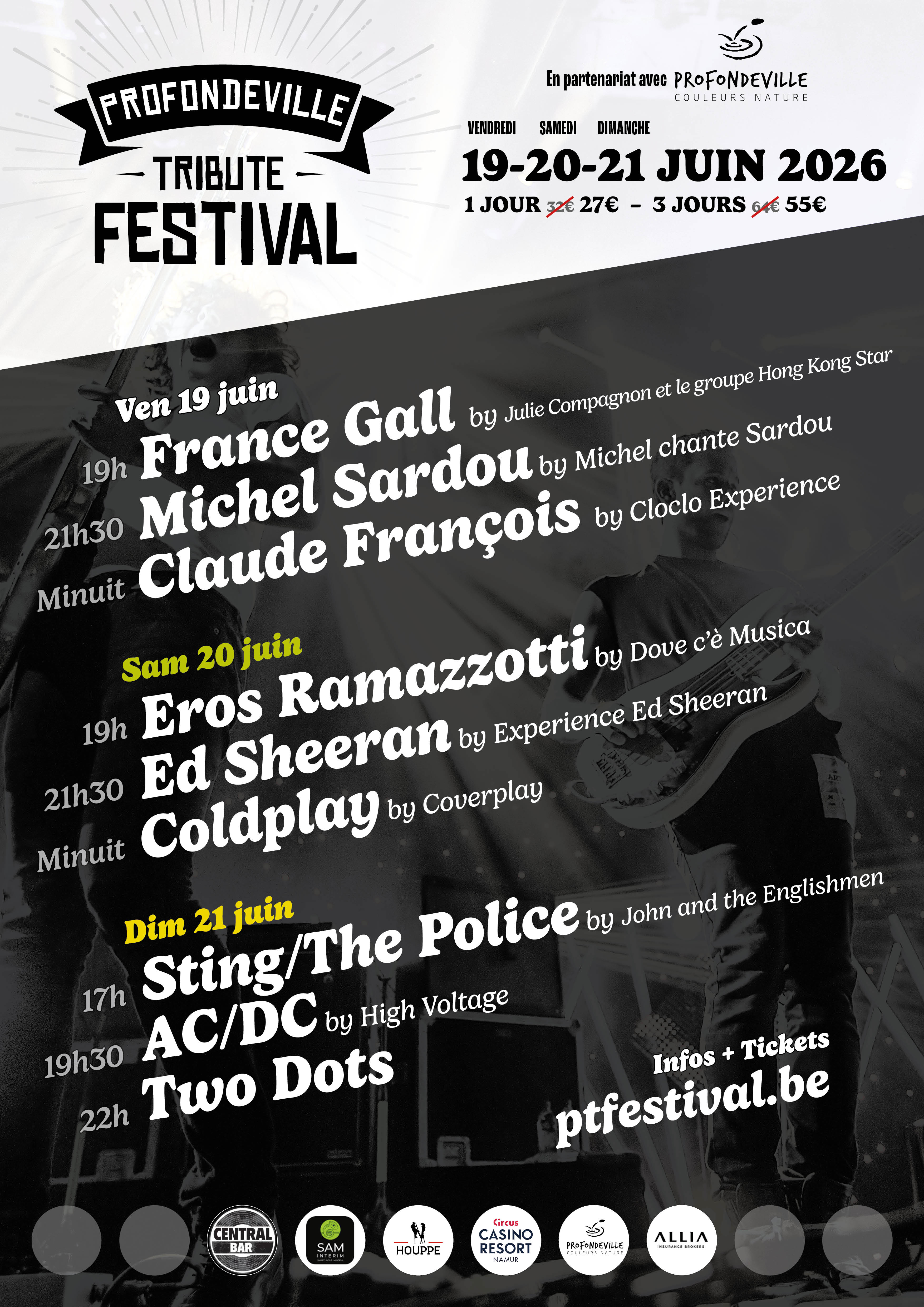 La 4ème édition du "Profondeville Tribute Festival" aura lieu les vendredi 19, samedi 20 et dimanche 21 juin 2026 sur le site de la place de l'Église à Profondeville.